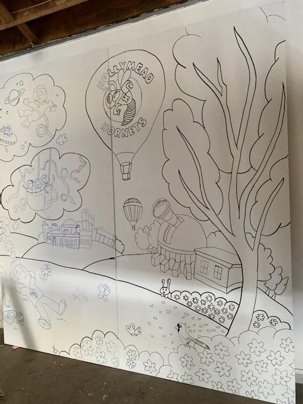 Once my design was approved, volunteers at the Charlottesville Mural Project went to work tracing the line art onto four 8×4 panels. The panels were then brought to Hollymead along with all 14 of the paint colors needed for the students to complete the project.