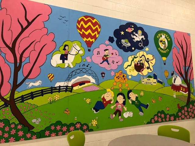 Hollymead had some delays in finding the best location to display the mural and in getting it mounted nicely, so it didn’t go up until last August. It now hangs proudly in the school cafeteria. Everyone involved did a great job!