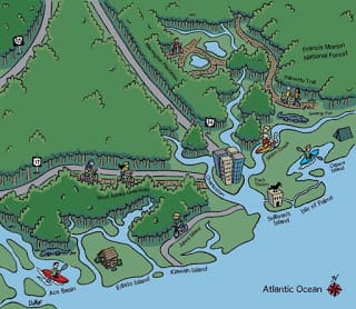 Been fairly busy lately updating my website and doing a two-week beach vacation with the family, so I’ve gotten a little behind with my blog. Here are the latest map illustrations for Blue Ridge Outdoors. The first one, appropriately enough, is focused on the coastal town of Charleston, South Carolina. I got to draw some alligators for this one, so that was pretty fun.