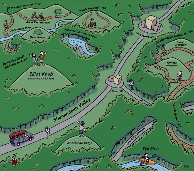 My latest cartoon map illustration in this month’s issue of Blue Ridge Outdoors features Harrisonburg, Va.