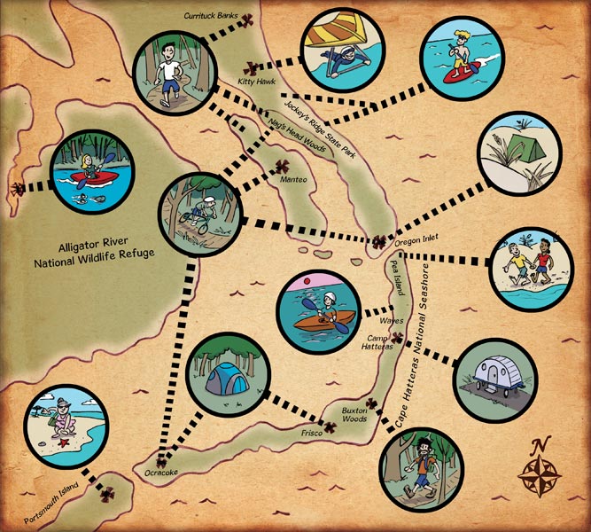 This month’s map for Blue Ridge Outdoors covers the Outer Banks of North Carolina and is a fun departure from my usual approach. The features highlighted for the article cover the full length of the OBX, which gave me the perfect excuse to go for a bit of a pirate map look, with the treasures being the various locations.