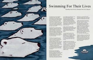 Here’s the completed illustration with layout for the polar bear article. I may need to tweek the colors once I’ve seen a printout. The light blue of the water highlights came out ridiculously dayglow before. Would love some feedback.