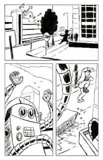 As promised, here is the inked version of my robot attack sequence. You can see the pencil version here. I think I may have to add an extra panel between the 4th and 5th frames to show the tower-bot in the middle of transforming. The way it is now, one panel there’s a tower, the next there’s a new robot.