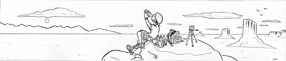 This the inked drawing, which I did at roughly 3’x13′. Its times like this I love Photoshop’s photo merge feature. The landscape changed quite a bit once I looked up some actual reference images for Utah. Note I originally showed the guy with a six-pack, but changed it when the client pointed out the safety hazards of mountain climbing after that much consumption.
