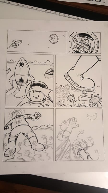 A Charles Addams-style cartoon of a weary space traveler who unknowingly arrives at…The Wrong Planet! Wrong Planet was a single-page comic I did for a graphic novel class I took while attending VCU. I came across my rough pencils for this when I was organizing my art drawer a few weeks ago and thought it would be worth finishing up. I’m so glad I did! Not only was it a lot of fun, but I’m really happy with how it came out. Since most of the panels are more or less square, I went ahead and broke them up into individual images so I can post them as my first-ever Instagram comic. Below are images of the original pencils I did way back when, along with a recent progress shot of the inking done with a combination of brush and crow quill pen.